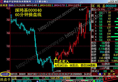 如,近期大盘暴跌以来,逆势上涨的深鸿基,8月19日15:00,60分钟操盘线发出B点买入信号,之后该股一路狂飙,涨幅高达35%