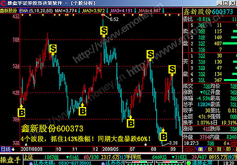 如,鑫新股份,07年8月至今,按照操盘手的买卖信号操作,4个波段,总共抓住143%涨幅!同期大盘暴跌60%